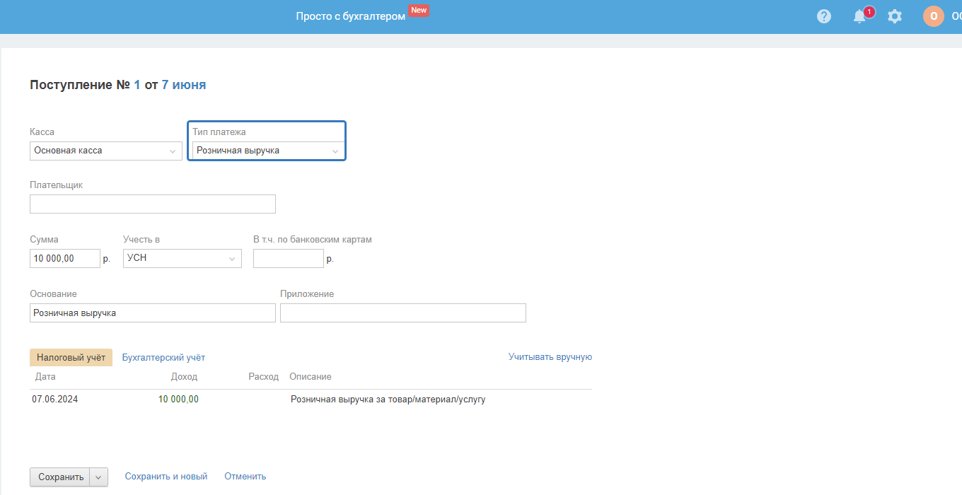 При добавлении операции автоматически будет создан Приходный кассовый ордер от руководителя организации или индивидуального предпринимателя и соответствующая запись в кассовой книге.
