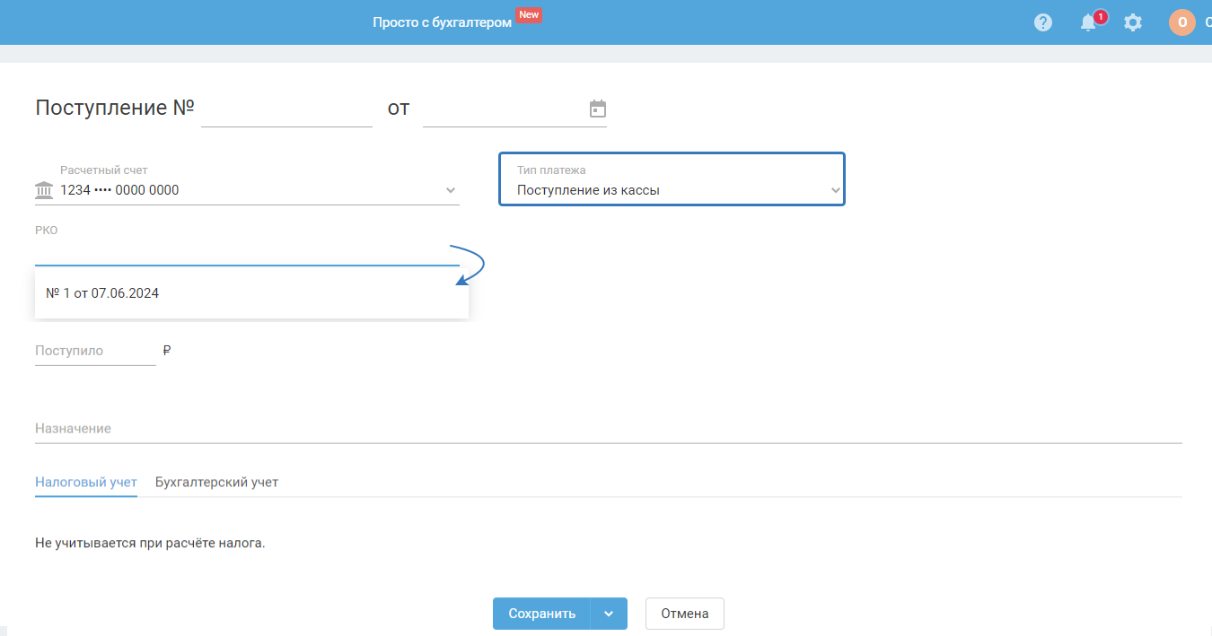 — В строке «ПКО» — в поле необходимо выбрать созданное в «Кассе» → «Поступление с расчётного счёта».