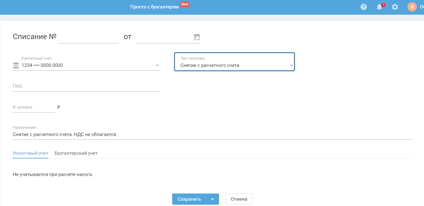 Выберите тип списания «Снятие с расчётного счёта» (тип используется для любого вида снятия наличных денег со счёта):
