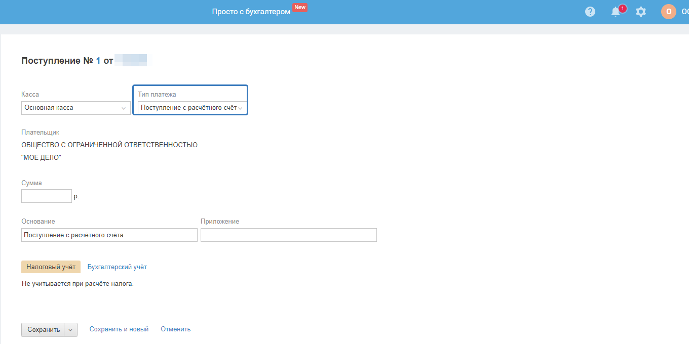 — В поле «Основание» — по умолчанию поле будет заполнено: «Поступление с расчётного счёта». При необходимости вы можете отредактировать данный текст на своё усмотрение и удобство.