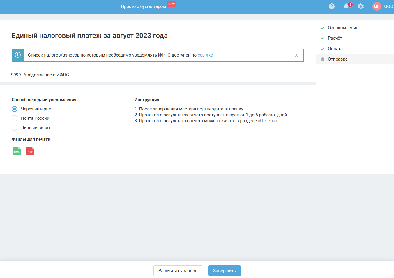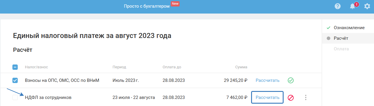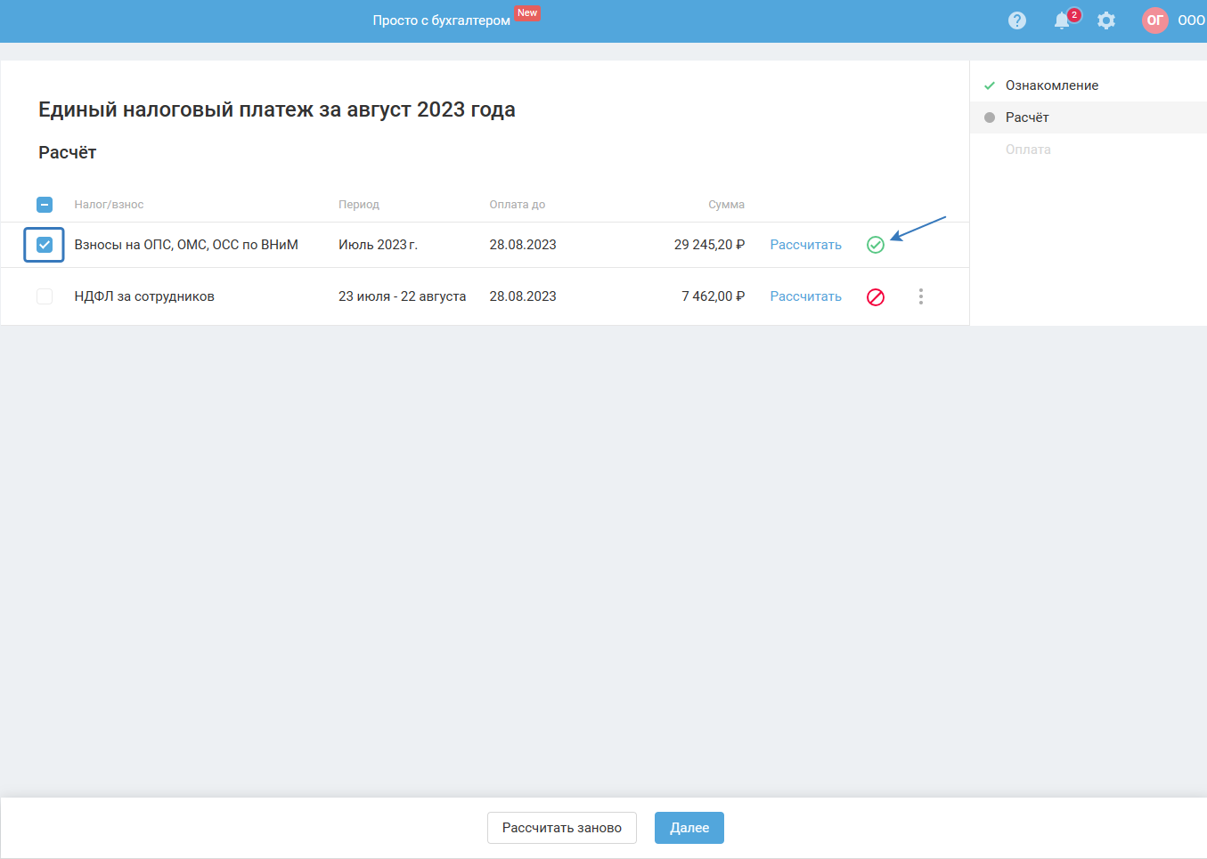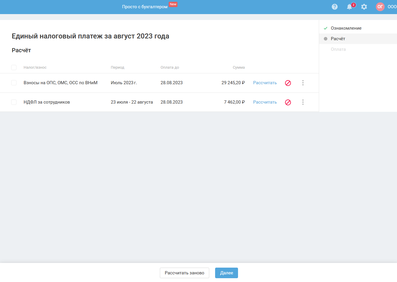 Если вам необходимо заплатить только один вид налога, то рассчитайте только его, и следуйте шагам мастера для оплаты. Для оплаты взносов по зарплате и НДФЛ за нужный месяц необходимо проходить заново завершённый мастер.