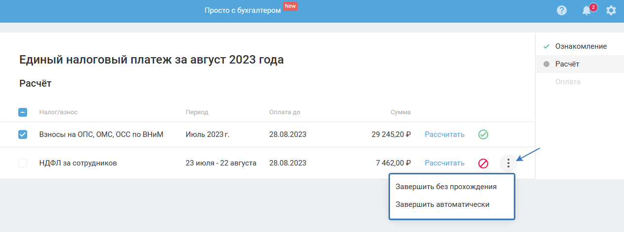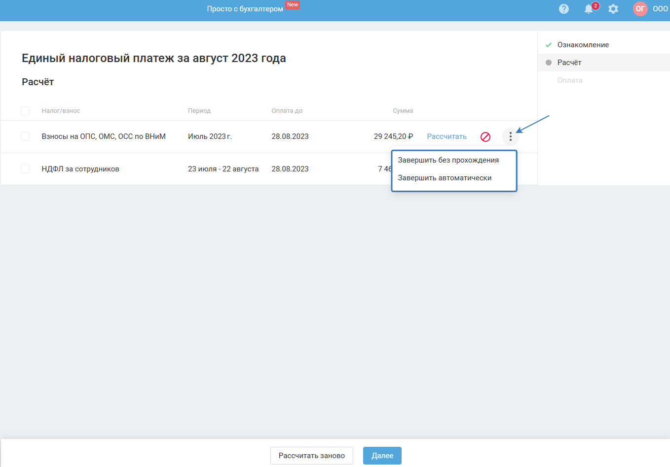 Нажав на три точки в правой части мастера, вы можете завершить мастер автоматически (доступно не для всех расчётов) или завершить его без прохождения. При авто завершение расчёта сервис расчитает сумму к оплате без перехода в мастер и учтёт её при форомирвание ЕНП. При завершение без прохождения сервис завершит событие без расчёта суммы к оплате:
