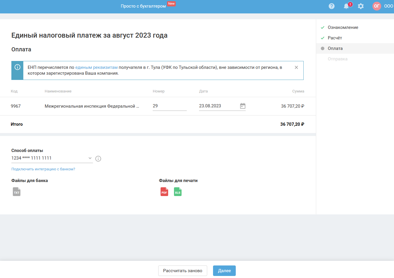 На третьем шаге формируются платежи для оплаты налогов. С 01.01.2023 все налоги и взносы оплачиваются на единые реквизиты ( УФК в городе Тула) и КБК.