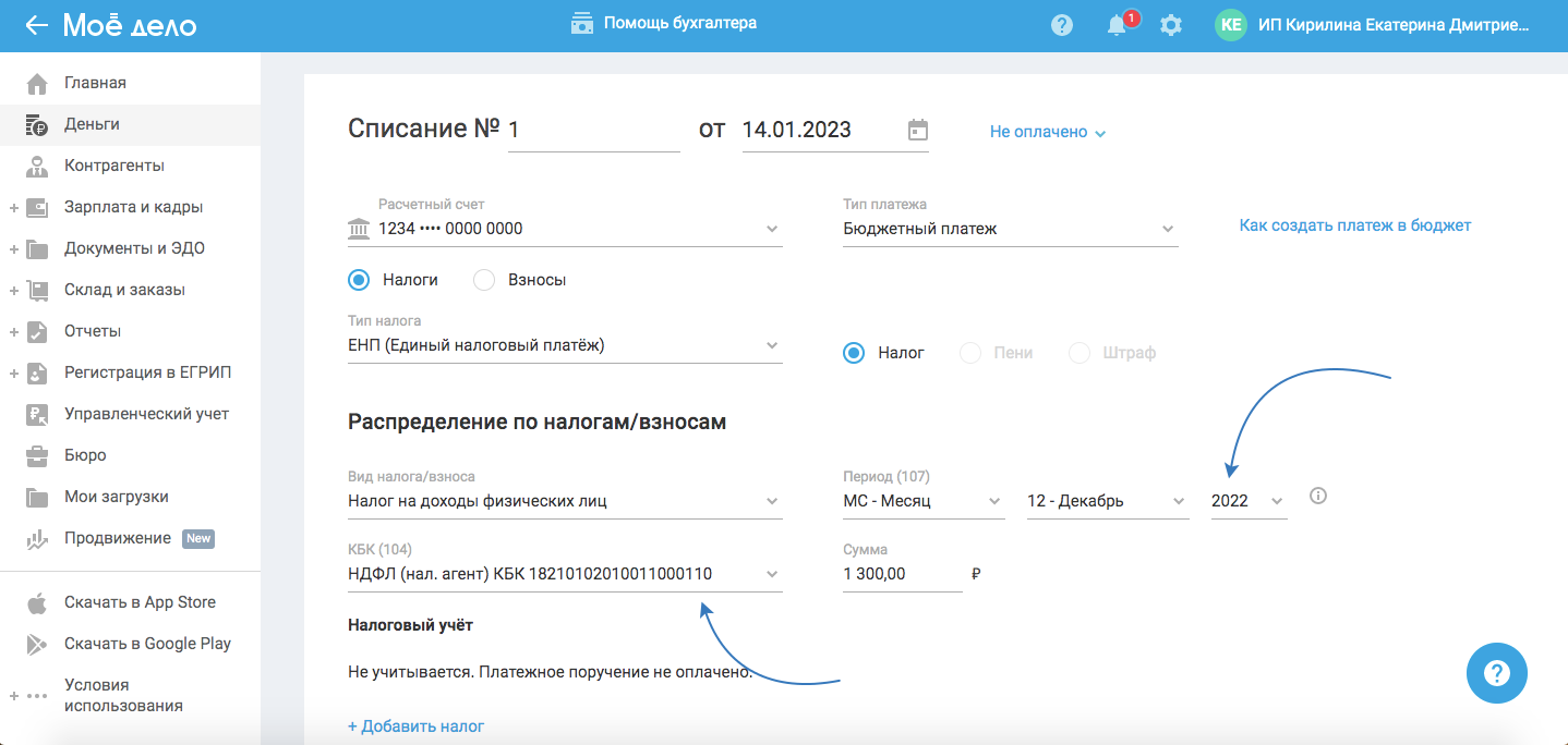 Для формирования платежного поручения перейдите в раздел «Деньги». Создайте списание. Выберите «Бюджетный платеж» — «Налоги»— «ЕНП (Единый налоговый платеж)». В поле «Распределение по налогам/взносам» выберите «Налог на доходы физических лиц», укажите период Декабрь 2022 года, в поле «КБК» выберите КБК в зависимости от применяемой ставки. В строке «Сумма» укажите сумму НДФЛ за декабрь 2022 года.