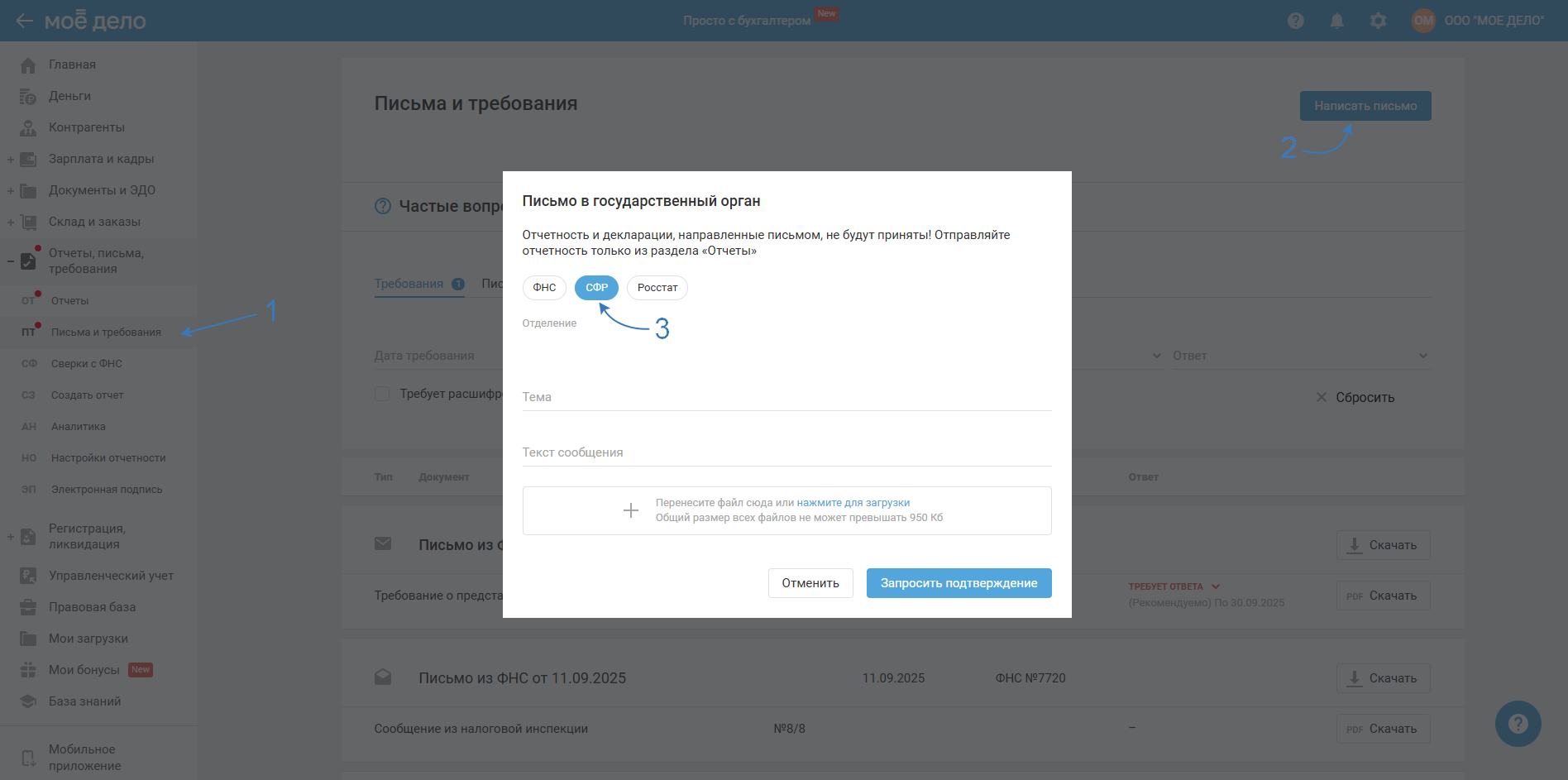 Можно. Нужно зайти в радел «Отчёты, письма, требования — Письма и требования», нажать на кнопку «Написать письмо» и в открывшемся окне выбрать СФР: