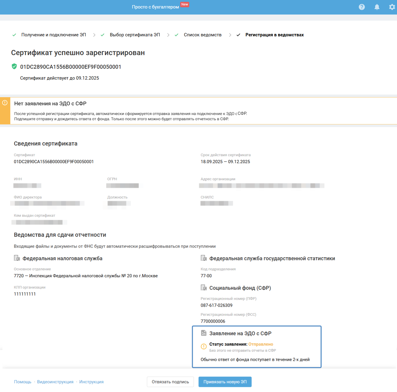 Если заявление раньше в сервисе не отправлялось, то после успешной регистрации сертификата в личном кабинете авоматически сформируется отправка заявления на подключение к ЭДО с СФР.