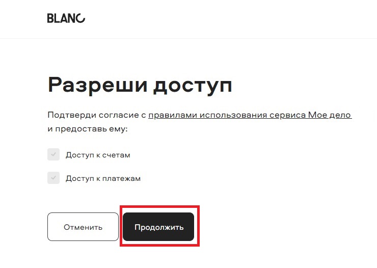 4. После авторизации в окне «Разреши доступ» можно ознакомиться с правилами использования сервиса «Моё дело» и выданными доступами.