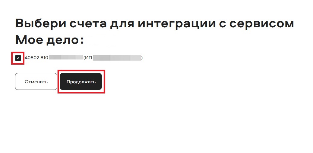 5. На следующем шаге необходимо выбрать расчётные счета, с которыми необходимо настроить интеграцию с сервисом «Моё дело», и нажать на кнопку «Продолжить».