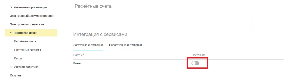 1. Для включения интеграции в сервисе «Моё дело» необязательно вносить сведения о расчётном счете. В разделе «Реквизиты» → «Настройки денег» включите переключатель в блоке «Интеграция с сервисами» — «Доступные интеграции» напротив партнера «Бланк».