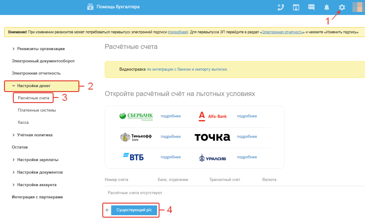 Затем перейдите в раздел «Настройки денег» - «Расчетные счета» и нажмите на кнопку «+ Существующий р/с», чтобы добавить расчётный счет.