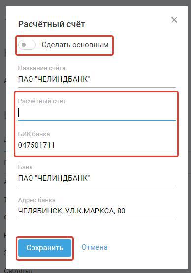 В поле «Расчётный счёт» наберите ваш расчетный счет в Челиндбанке. Вы можете сделать этот счет основным, нажав на кнопку «Сделать основным».