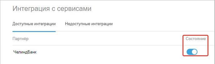 Теперь перейдите в раздел «Настройки денег». Во вкладке «Доступные интеграции» найдите «Челиндбанк». Нажмите на тумблер для того, чтобы включить интеграцию.