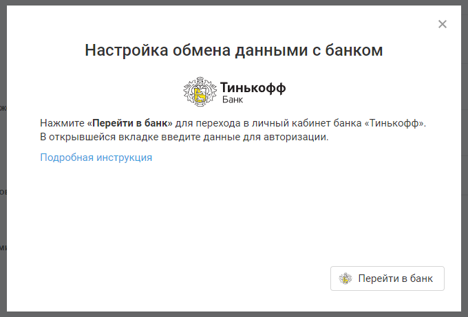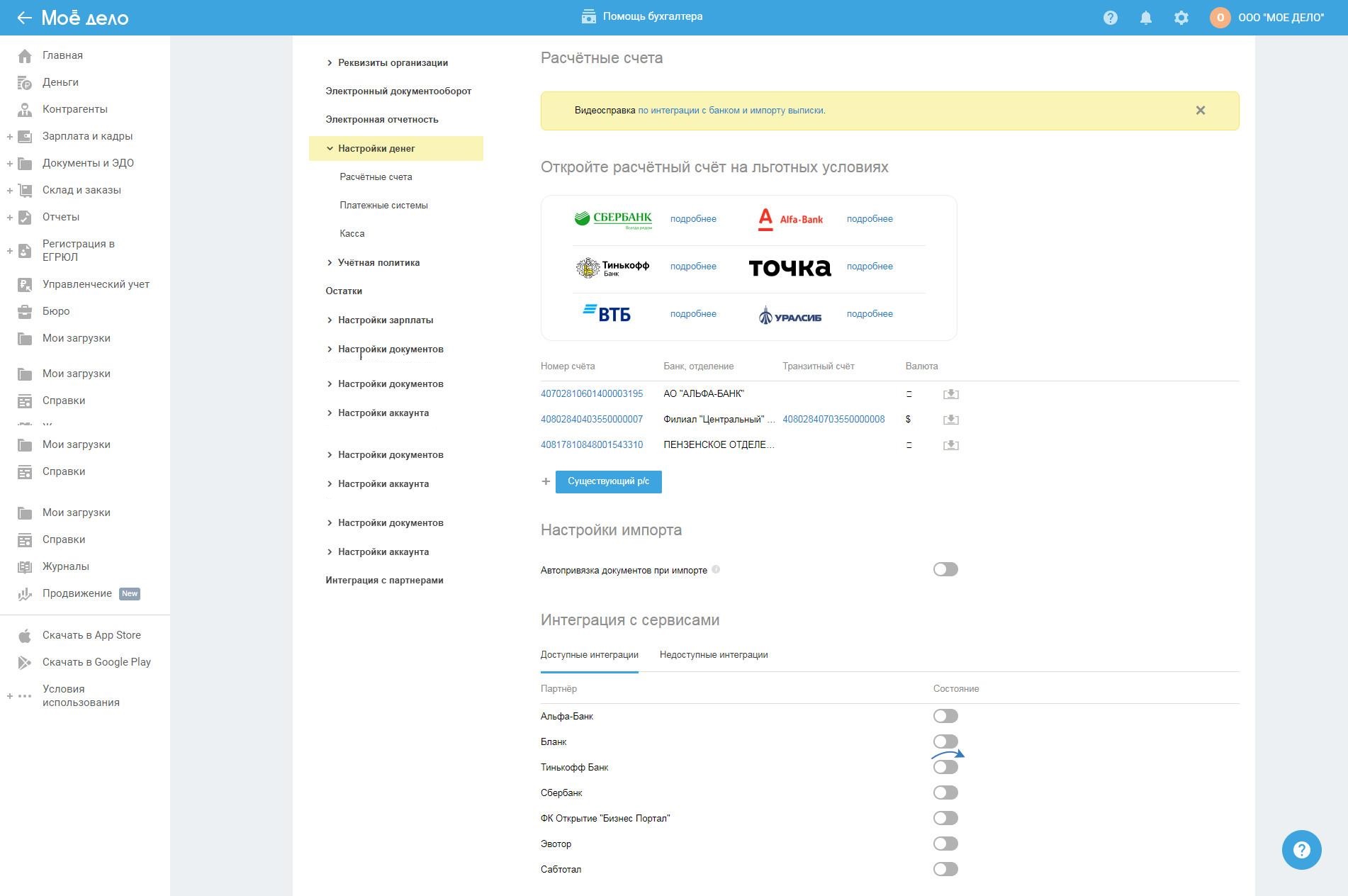 Настройка интеграции с Банком Тинькофф осуществляется из сервиса Моё дело.