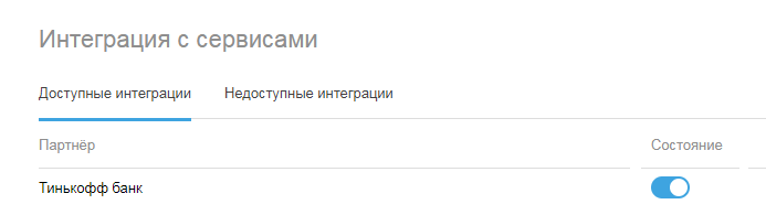 5. Если вы все сделали правильно - пункт «Тинькофф банк» в блоке «Доступные интеграции» будет с включенным переключателем (переключатель синего цвета).