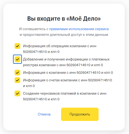 Остальные пункты являются обязательными и необходимы для работы сервиса. Снятие с них галочек не позволит подключить интеграцию.