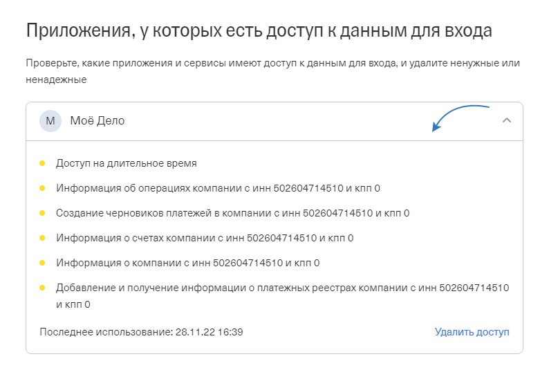 4. В личном кабинете Тинькофф банка в разделе "Управление профилем" →"Безопасность" будет отражаться информация о настроенной интеграции с сервисом Мое Дело.