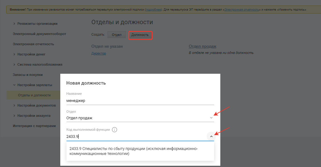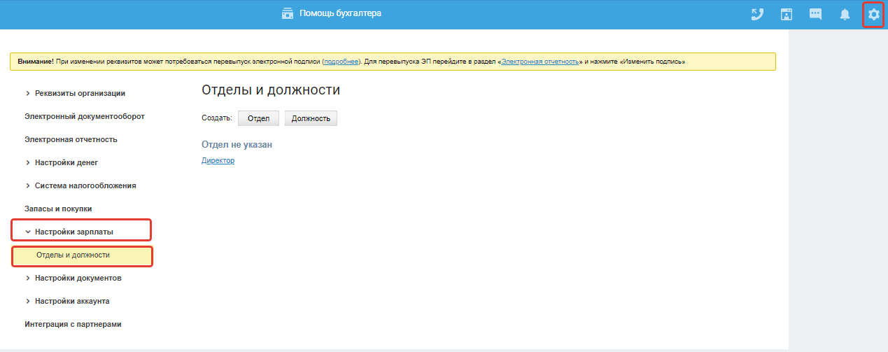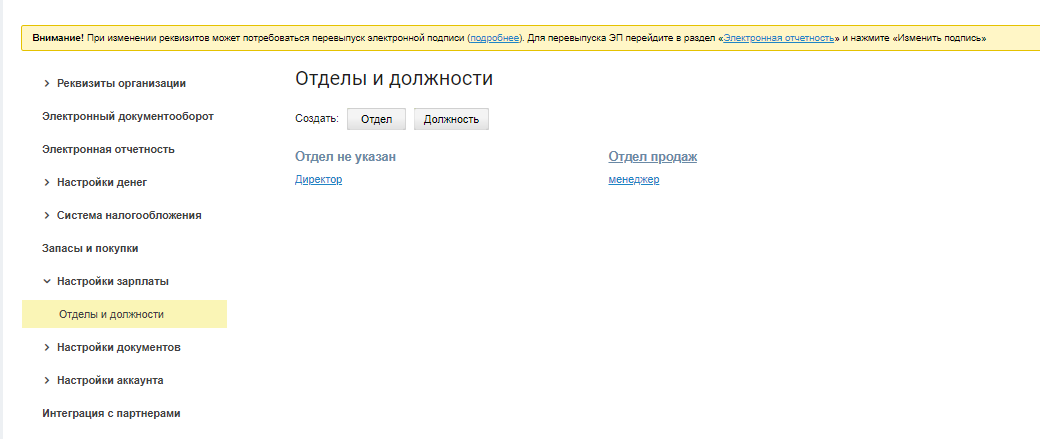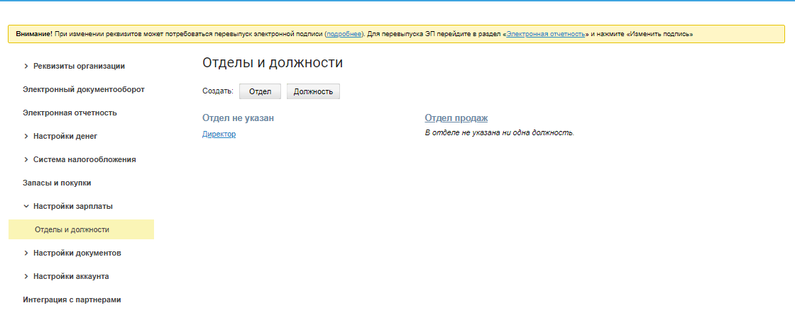 Раздел "Реквизиты"- "Настройки зарплаты" -"Отделы и должности" доступен для заполнения только на тарифах для ИП-работодателей (с сотрудниками) и ООО.