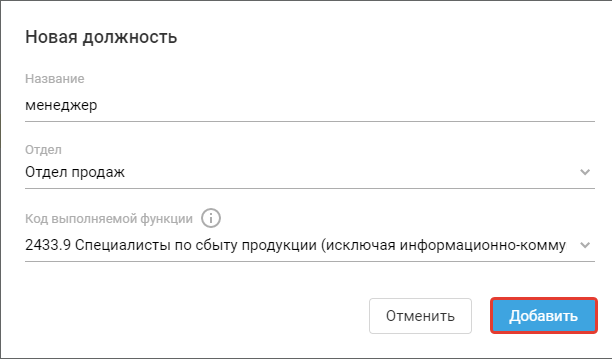 Для того, чтобы добавить должность, в строке "Создать" нажмите на кнопку "Должность". В открывшемся окне введите название должности, из выпадающего списка выберите отдел, к которому она относится. Также заполните строку "Код выполняемой функции", его можно выбрать из выпадающего списка, либо начав вводить значение кода или название группы занятий.