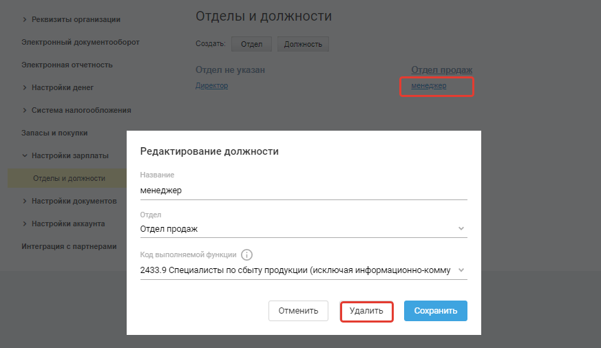 Для удаления должности нажмите на нее и в открывшемся окне нажмите на кнопку "Удалить".