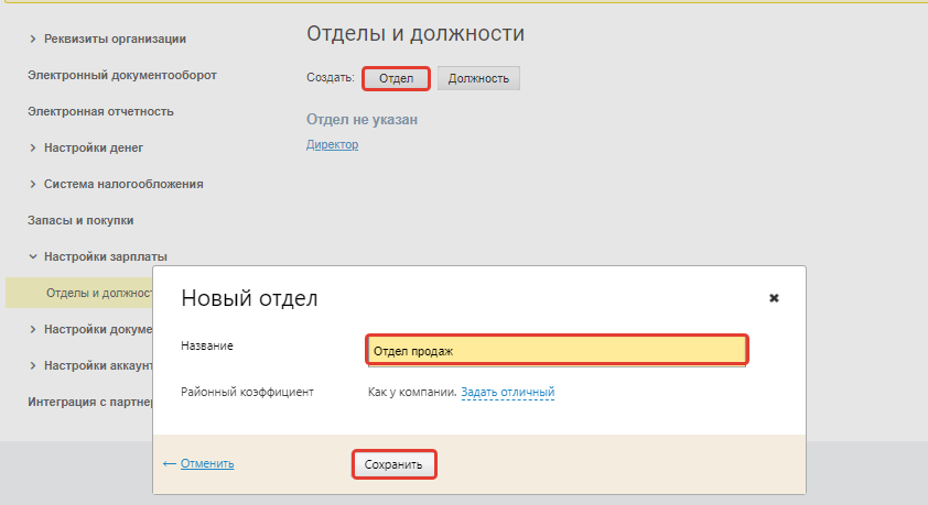 Для создания нового отдела в строке "Создать" нажмите на кнопку "Отдел". В открывшемся окне введите название отдела, также можно задать районный коэффициент. Затем нажмите на кнопку "Сохранить".