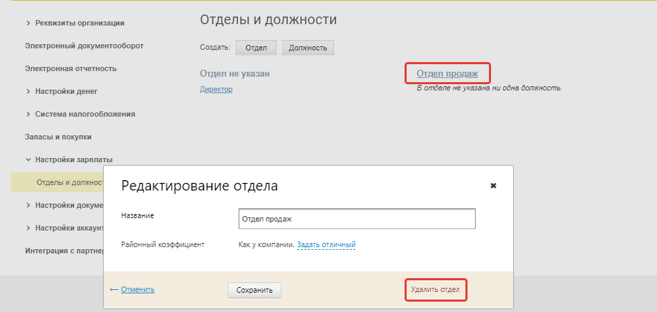 Для удаления отдела из сервиса нажмите на его название и в открывшемся окне нажмите на кнопку "Удалить отдел".