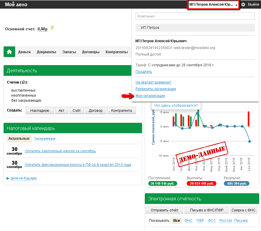 В сервисе "Мое дело" реализована возможность вести учет сразу нескольких организаций или ИП. Чтобы ей воспользоваться нужно перейти по ссылке "Мои организации". Эта ссылка находится в выпадающем меню при наведении курсора на название компании.