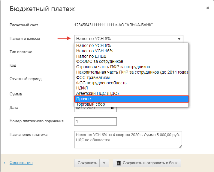 После чего в строке "Налоги и взносы" выбрать из выпадающего списка "Прочее".