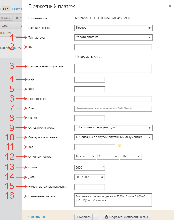После оплаты платежа в банке, в поле “налоги и взносы” укажите тип, который был указан изначально. Обязательно проверьте заполнение поля “Отчетный период” и укажите в нем значение в соответствии с платежкой в ДБО банка.