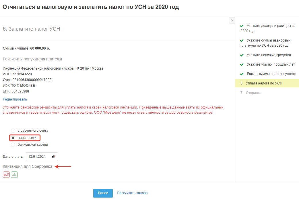 Для ИП возможно оплатить бюджетный платеж не только с р/сч, но и наличными. Поэтому в блоке «Заплатите налог УСН» есть возможность скачать квитанцию для сбербанка (в pdf или xls).