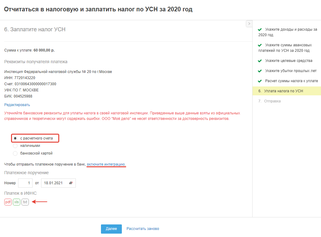 Организация оплачивает обязательные бюджетные платежи только с р/сч организации. Поэтому в блоке «Заплатите налог УСН» есть возможность скачать печатную форму п/п или файл для загрузки в интернет-банк.