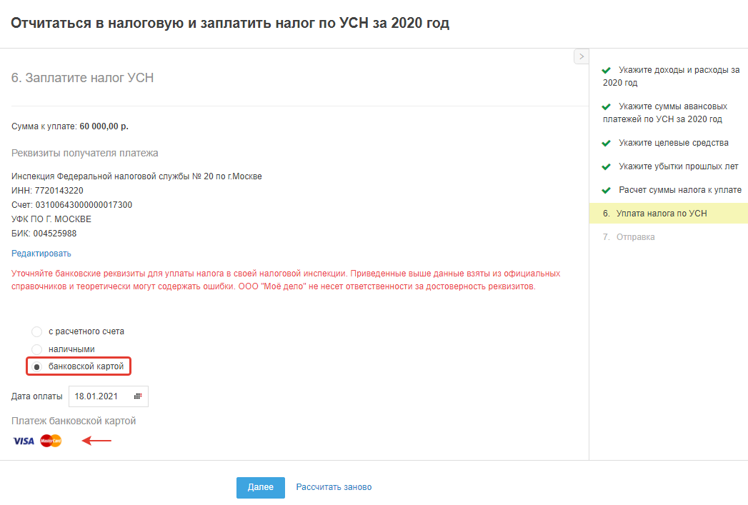 Кроме того, ИП может оплатить налог с помощью банковской карты. Для этого укажите способ оплаты - «Банковской картой».