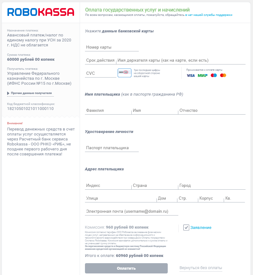 После нажатия на кнопку в виде платежных систем Visa и Mastercard, вы будете перенаправлены на сайт платежного сервиса opg.robokassa.ru. В открывшемся окне введите реквизиты банковской карты и укажите сведения о плательщике, после чего нажмите «Оплатить».