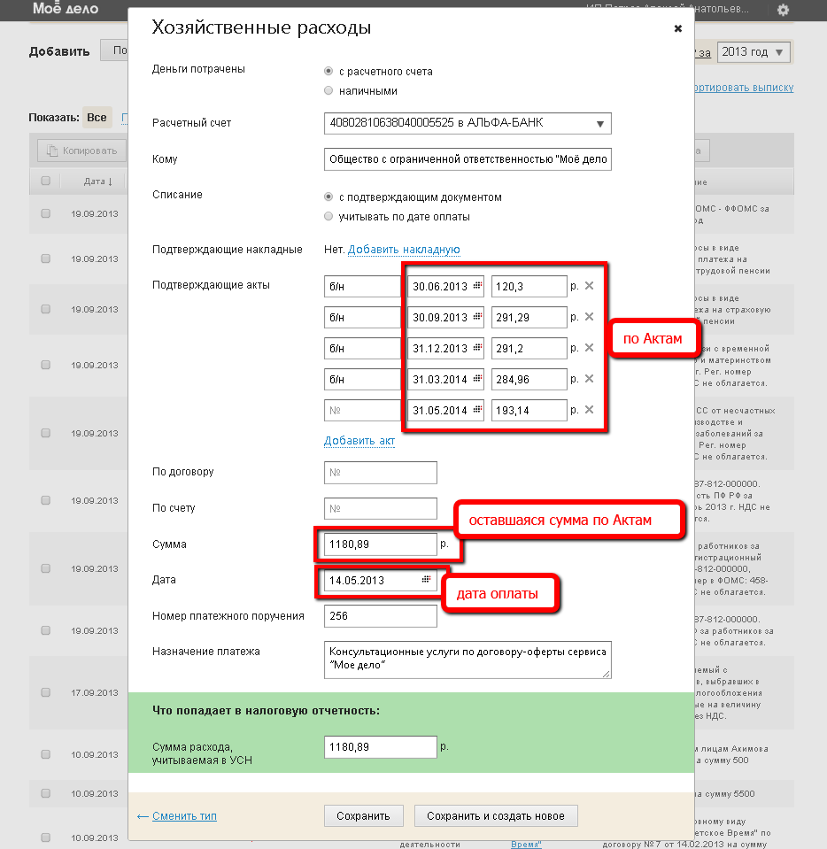 - в появившемся окне, после заполнения строки «Кому» (ООО «Моё дело»), в строке «Подтверждающие акты→Добавить Акт» указываете номер б/н, дату фактической оплаты, сумму из Акта приема-передачи;