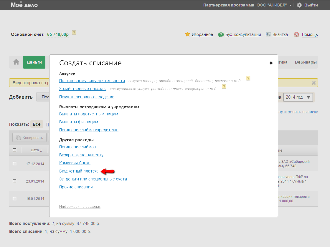 1. Сформировать платежное поручение на уплату недоимки, штрафа или пени по взносам в ФСС можно во вкладке "Деньги". Для этого нужно добавить "Списание" и выбрать тип "Бюджетный платеж".