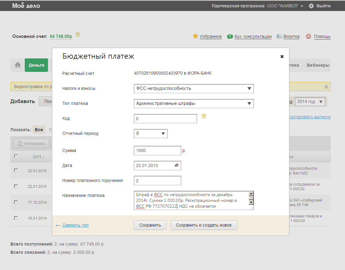 Для перечисления недоимки (задолженности), штрафа или пени в ФСС нужно сформировать платежное поручение. Это можно сделать в сервисе или в системе банка. После формирования платежного поручения в сервисе, его нужно загрузить в систему банка и провести платеж.