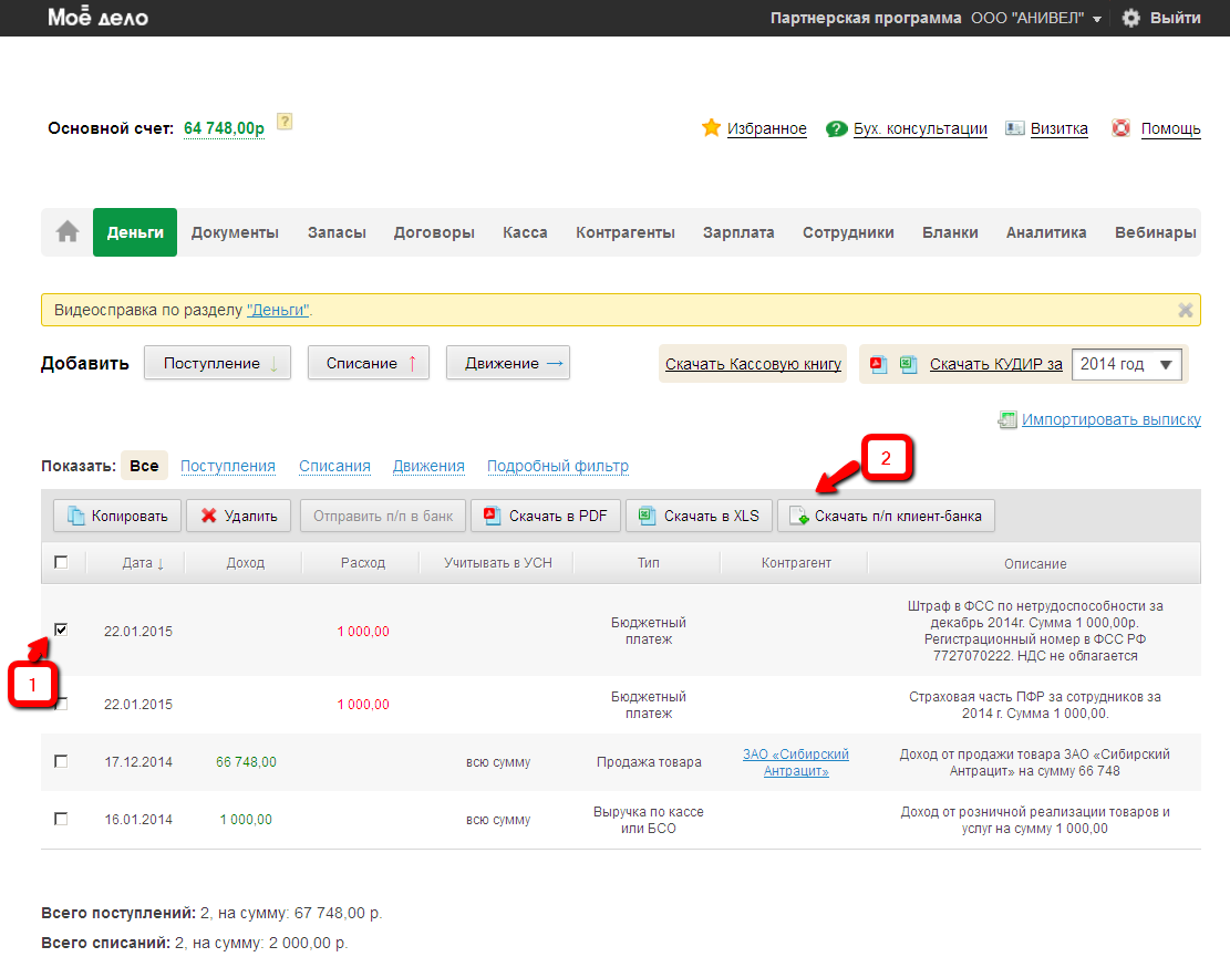 Если ранее вы подключили интеграцию с банком-партнёром, то будет доступен экспорт платежных поручений в клиент банк.