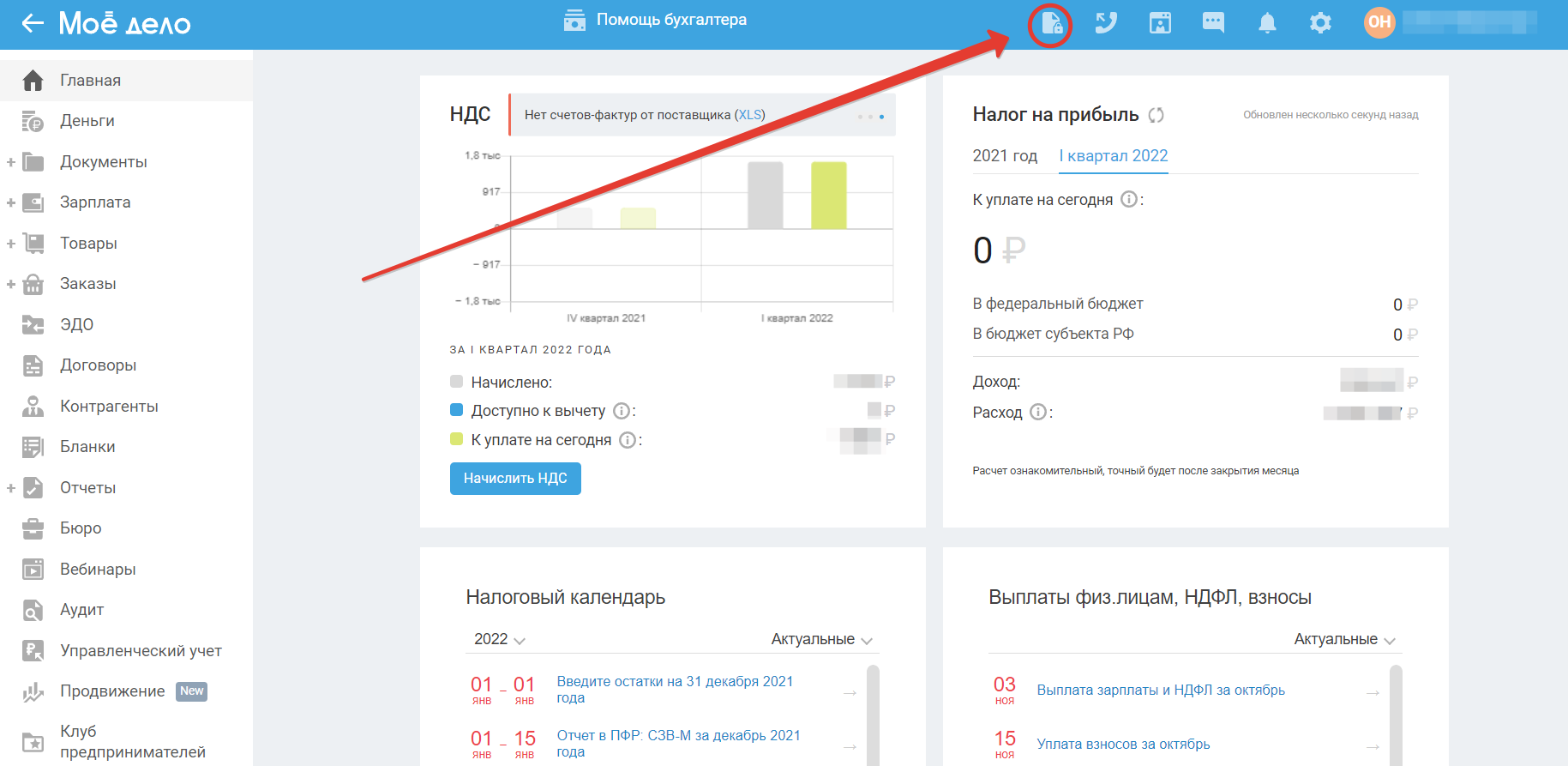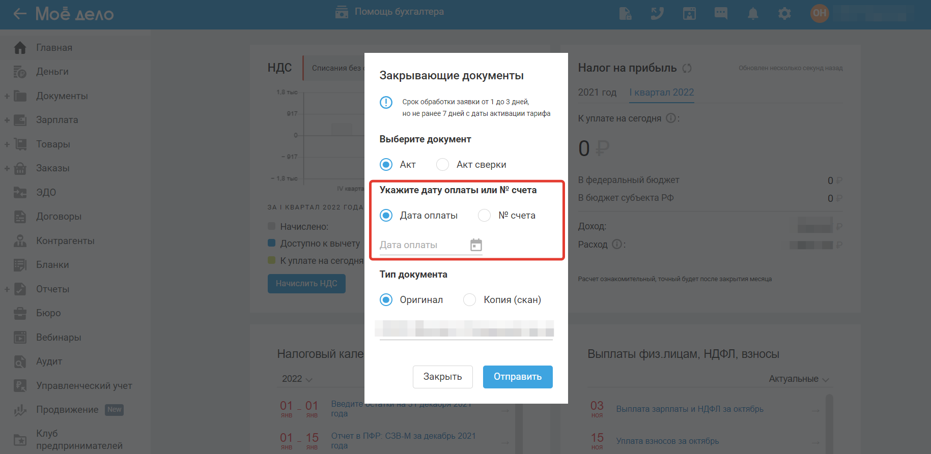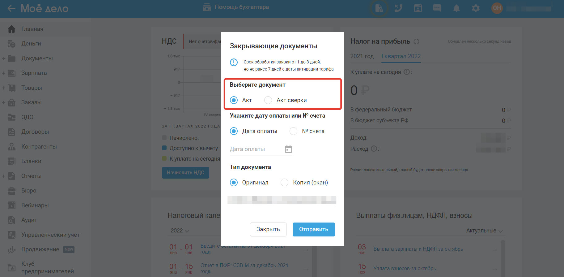 Для того, чтобы оставить заявку на получение закрывающих документов (акта или акта-сверки) на оплату сервиса «Моё дело» кликните по кнопке на главной панели сервиса сверху.