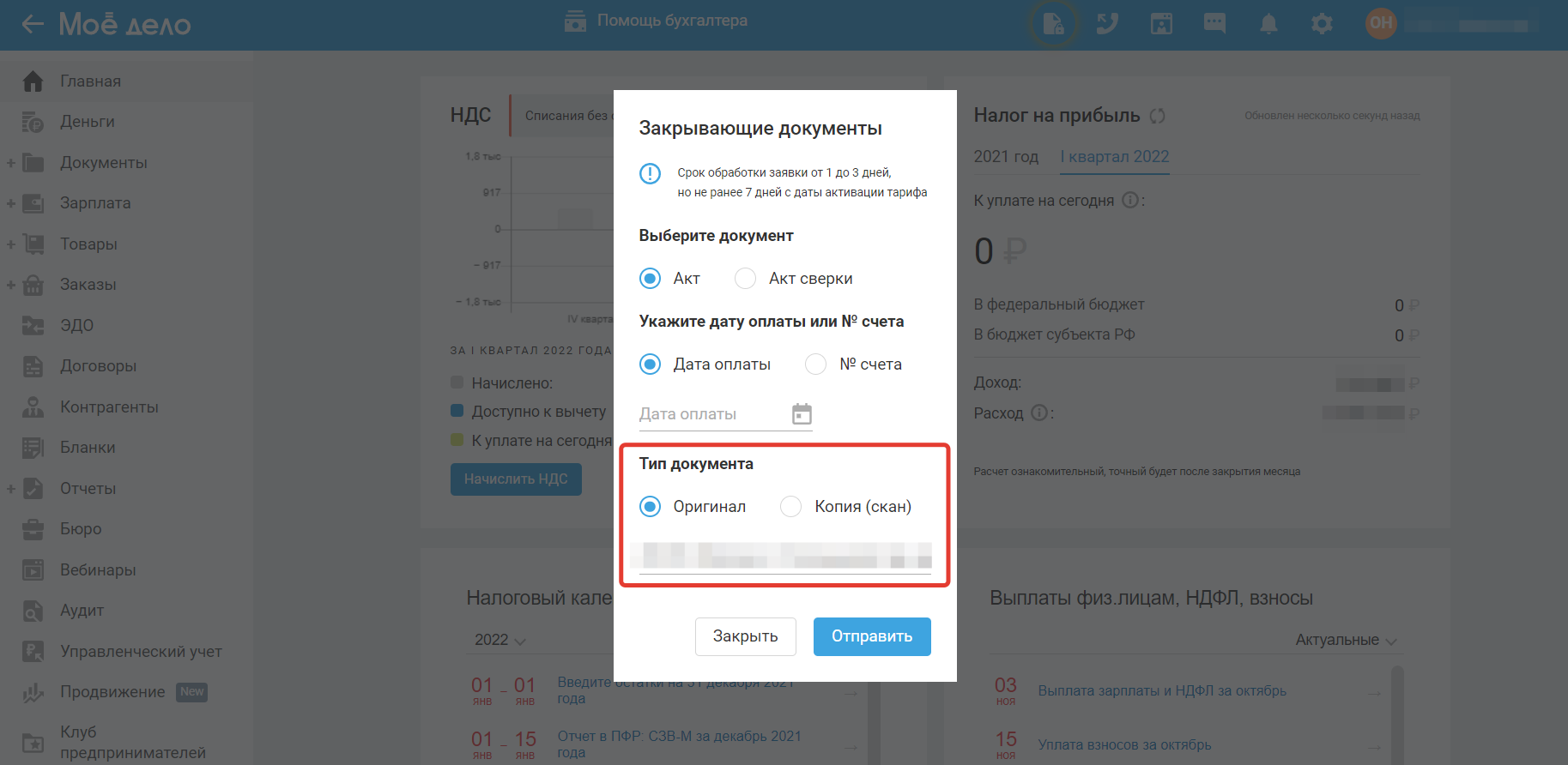 - «оригинал» — чтобы получить документы на бумаге по почте; для этого укажите почтовый индекс и адрес, по которому необходимо направить закрывающие документы;