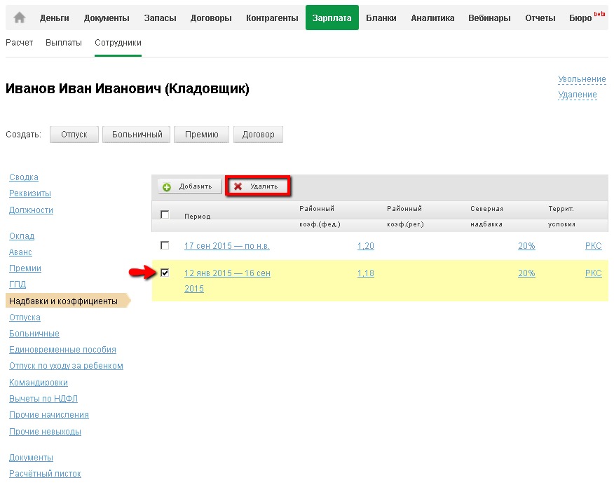 Чтобы удалить информацию о коэффициенте и надбавке (например, если они были добавлены по ошибке), напротив строки нужно поставить галочку и нажать на кнопку "удалить".