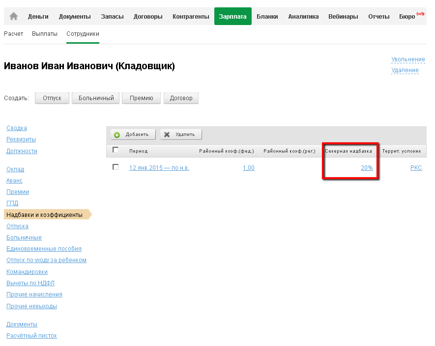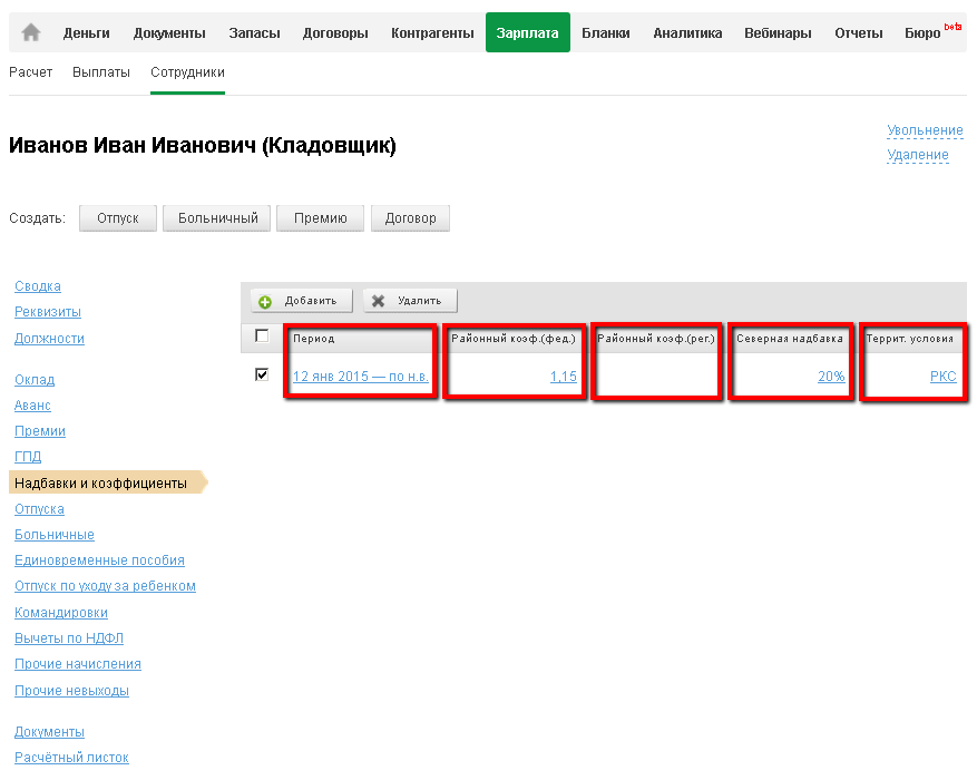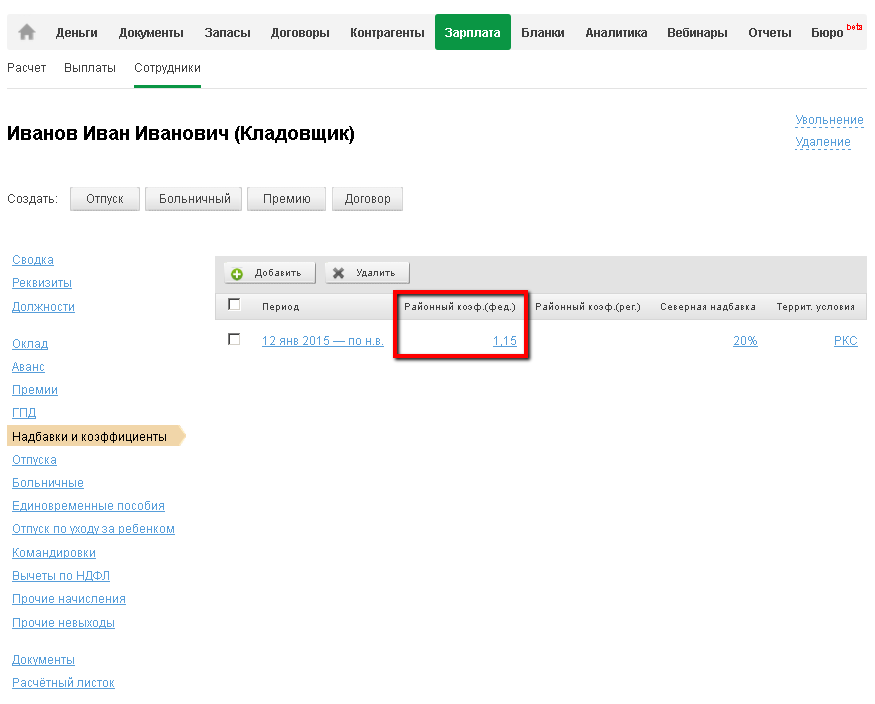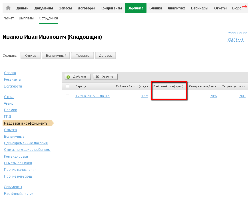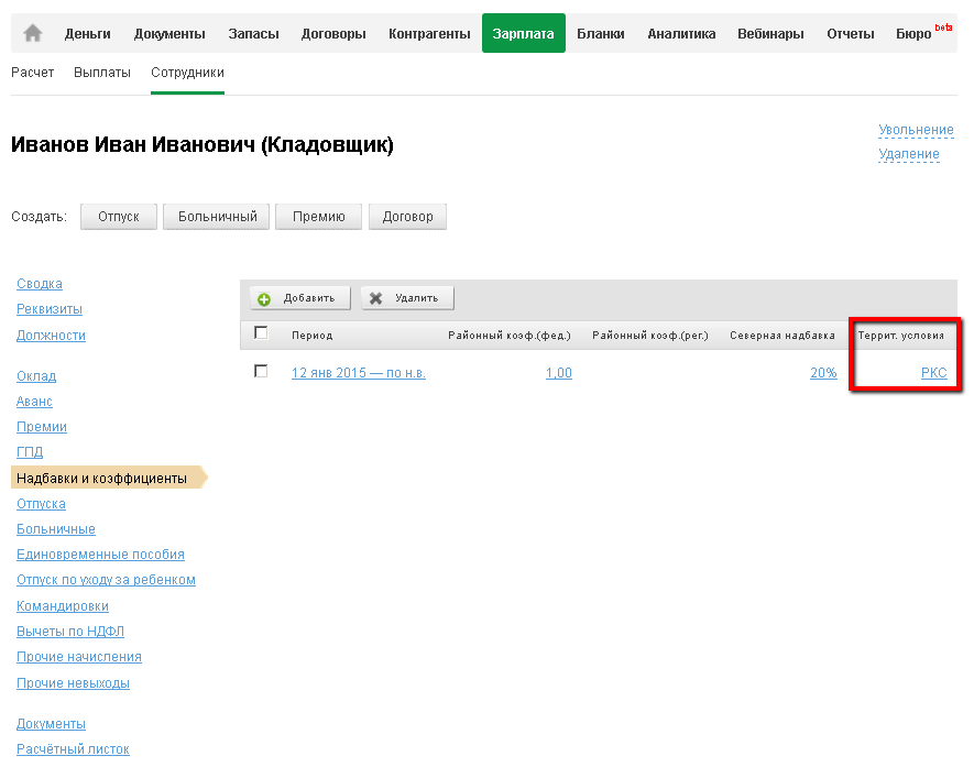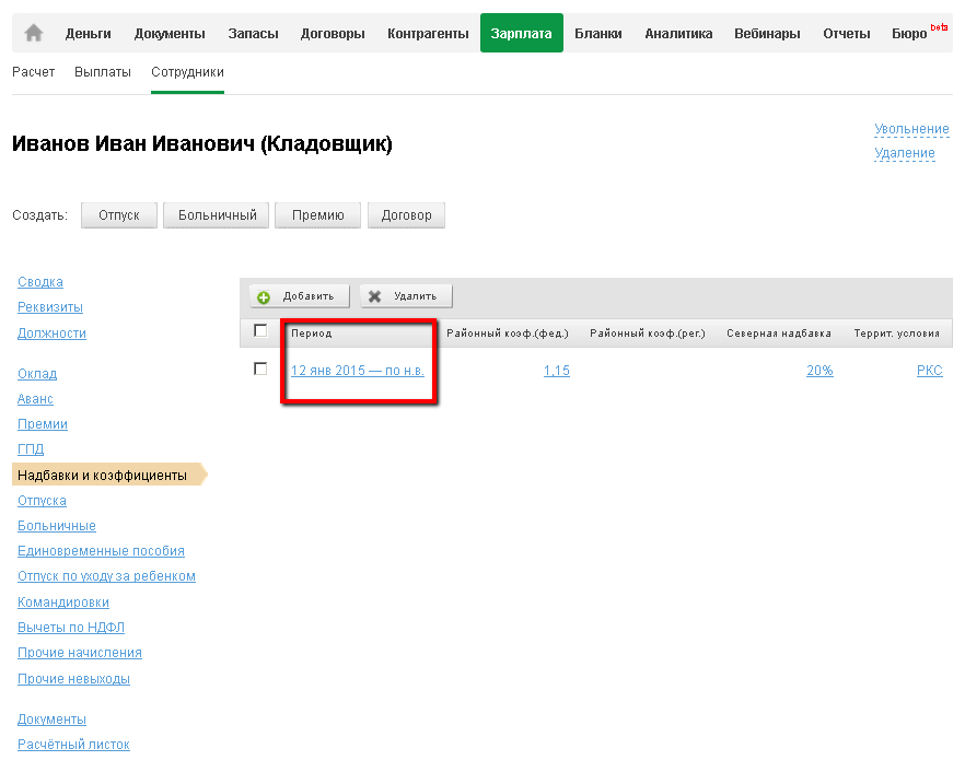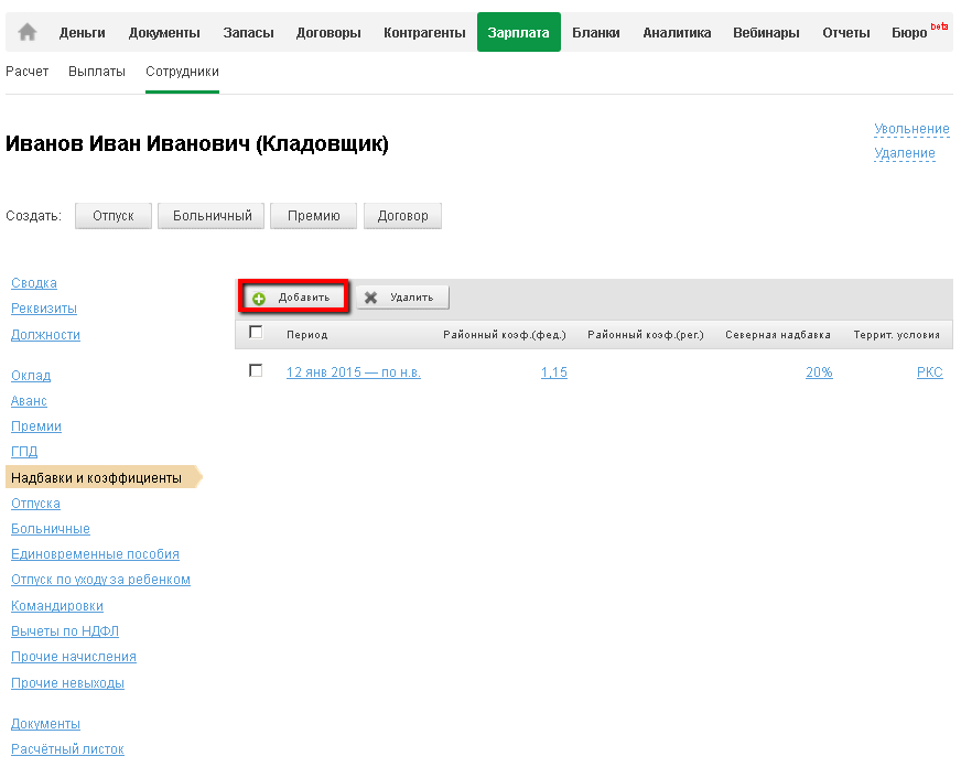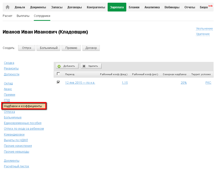 Этот раздел предназначен для добавления и редактирования информации о надбавках и коэффициентах, положенных конкретному сотруднику в связи с работой в районе с особыми климатическими условиями. Для начала работы нужно перейти в пункт бокового меню - "надбавки и коэффициенты".