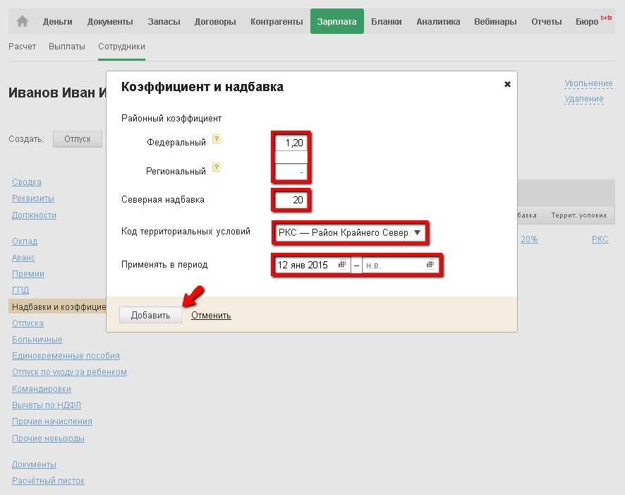- применять в период - период действия коэффициента и надбавки. После заполнения всех граф нажмите "добавить".