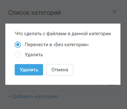 При удалении категории выберите действия по управлению файлами, находящимися в данной категории. Вам будет предложен выбор их перемещения в раздел "Без категории" или удаления: