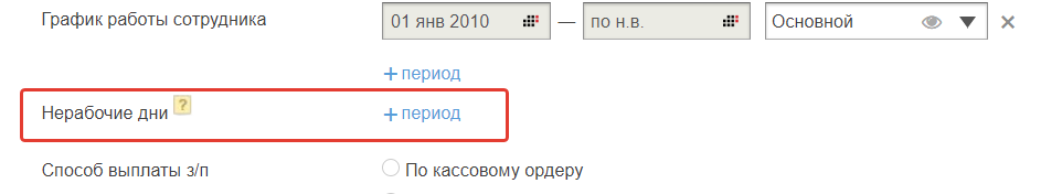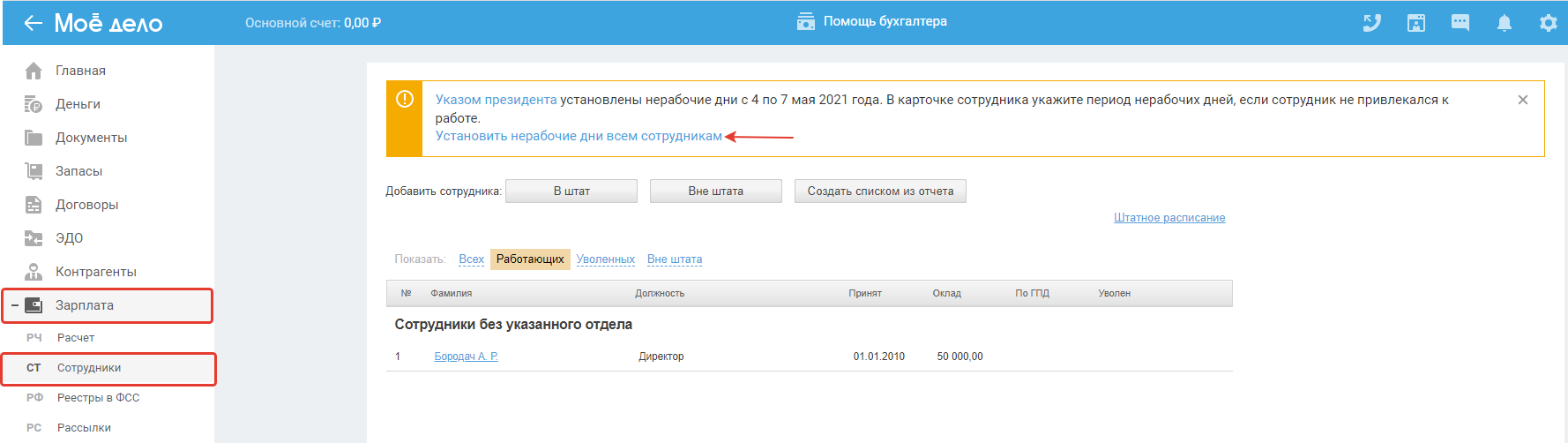 Для того, чтобы добавить период нерабочих дней массового всем сотрудникам, перейдите в раздел "Зарплата - Сотрудники" . В информационном сообщении нажмите на "Установить нерабочие дни всем сотрудникам".