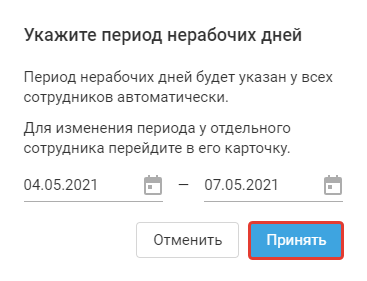 При нажатии на кнопку "Принять" в реквизитах штатных сотрудников проставится период нерабочих дней в поле "Нерабочие дни".