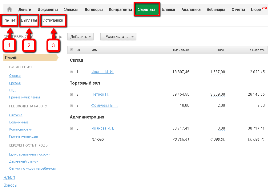 Вкладка «Зарплата» предназначена для проведения расчетов с работниками по всем операциям. Вкладка доступна для ИП работодателей и организаций.