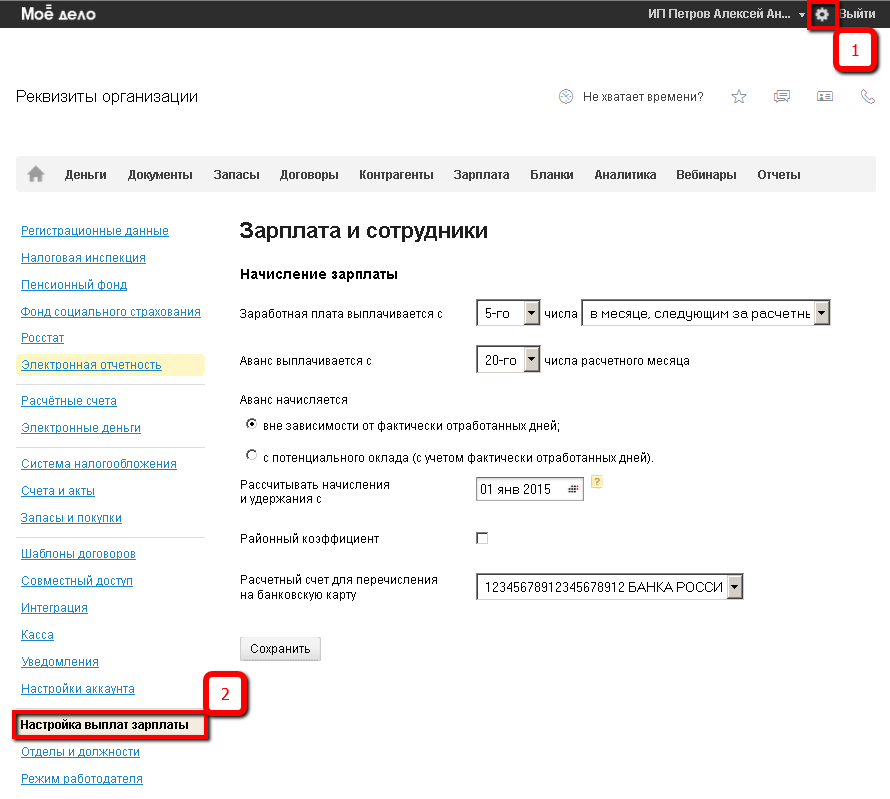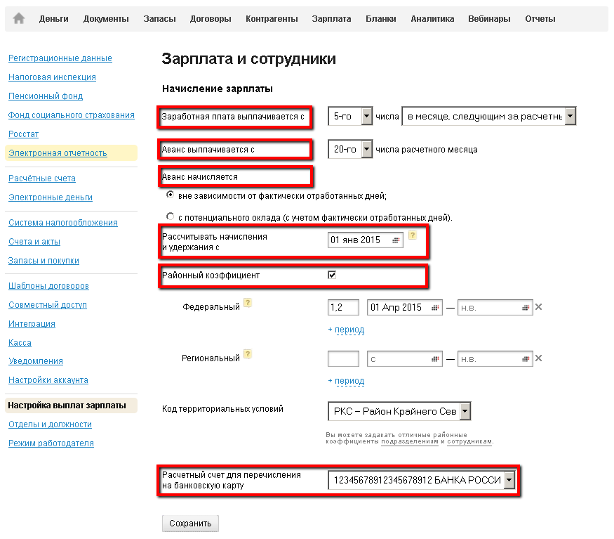 Указывается две даты (для выплаты аванса и зарплаты). Поскольку одним платежом зарплату за месяц платить, нельзя. На практике наиболее применяемые 5 число расчетного месяца и 20 числа месяца, следующего за расчетным. Но вы их можете определить на свое усмотрение. На эти даты в Календаре выплат на главной странице личного кабинета, будут отражать операции по выплатам аванса или зарплаты.