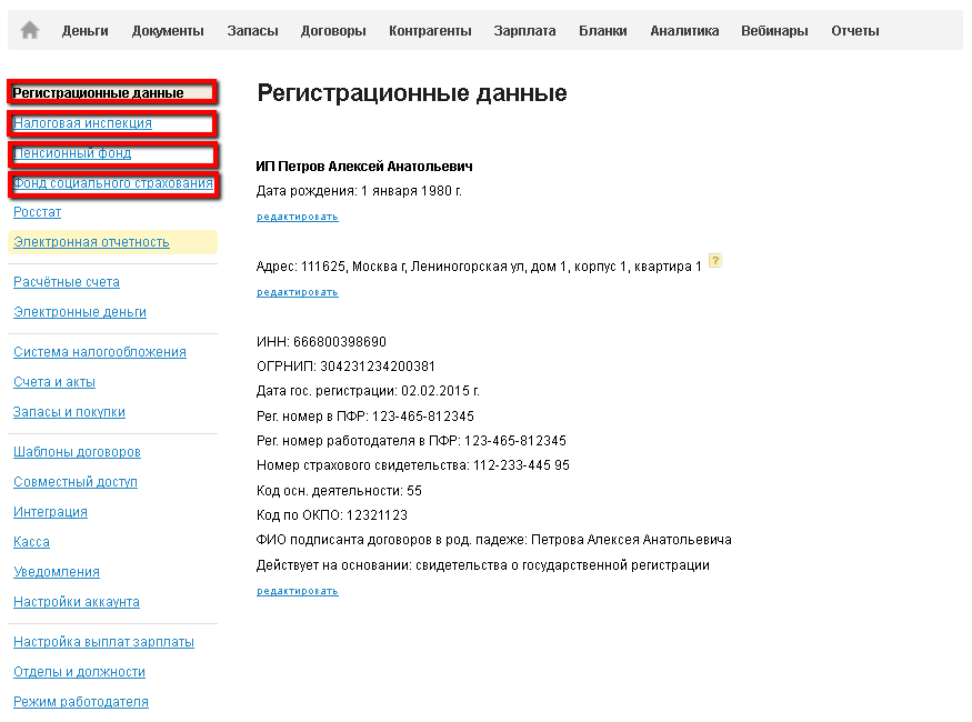 Сделать это можно во вкладке Реквизиты. Особенное внимание необходимо уделить таким разделам как "Регистрационные данные", "Налоговая инспекция", "Пенсионный фонд", "Фонд социального страхования".