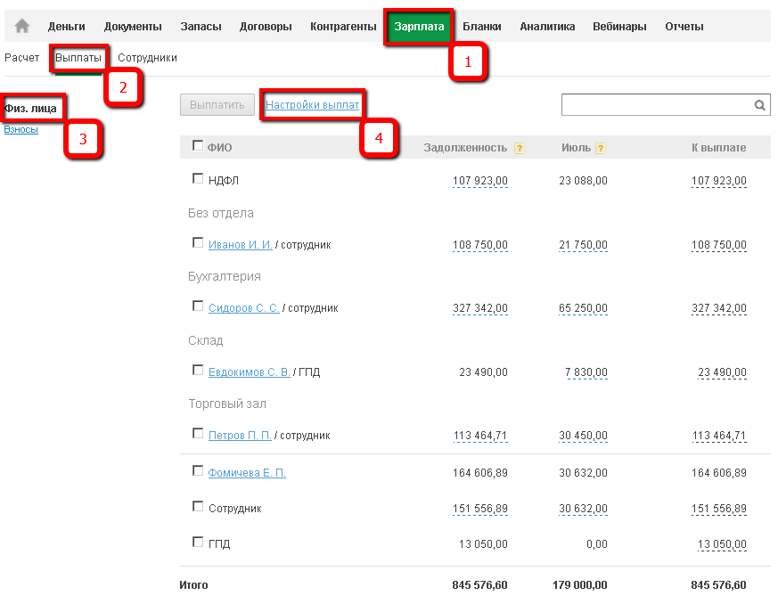 - выплаты - подраздел предназначен для управления выплатами. Информация о выплатах группируется сразу по всем работникам;