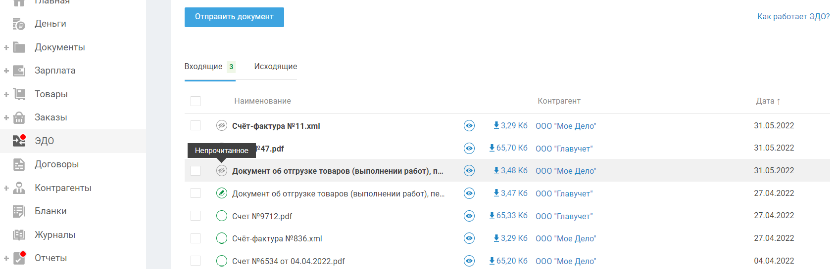 Раздел «ЭДО» можно рассматривать как электронный почтовый ящик для документов. Здесь видны все отправленные вами (вкладка «Исходящие») и полученные от контрагентов (вкладка «Входящие») документы, а также количество непрочитанных входящих документов.