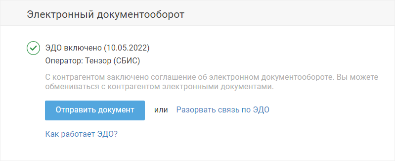 После того, как контрагент подтвердит приглашение, статус изменится на "ЭДО включено" .